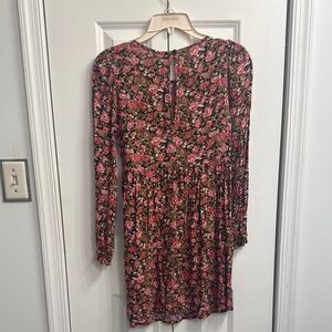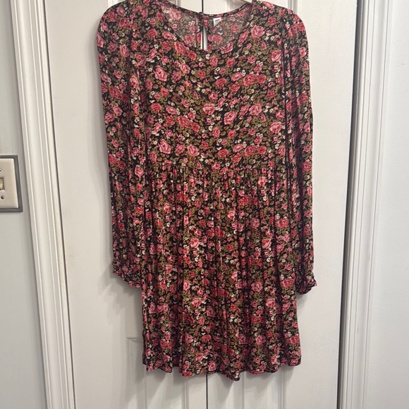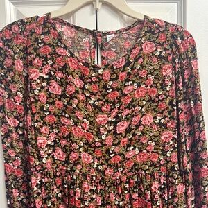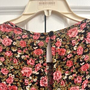Elegant dress with a vibrant floral pattern. Features pink and green flowers on a black base.