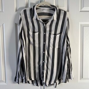 Stylish black and white striped button-up shirt. Features a classic collar and front pockets.