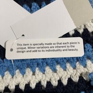 Fun in the sun cute halter style tie back crochet zig zag pattern of blue, black and white Ties at neck and back perfect for hot summer days light and airy fun for beach vacation shows lots of skin could wear over a bikini top as a cover