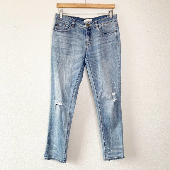 BP light wash blue denim distressed jeans. Whiskered and light distressing. Five-pocket styling, cotton blend stretch denim.