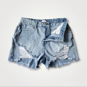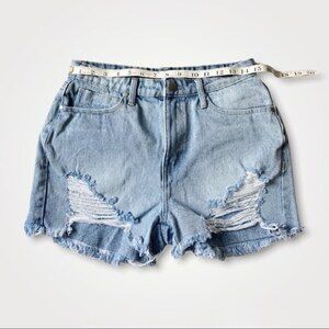 BP Nordstrom light wash denim shorts with distressed details and tattered front. High waist with zipper and button fly. Raw hem. Excellent preloved condition.