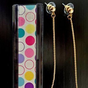 Stunning long gold chain dangle earrings with two faux pearls at the bottom in new condition.