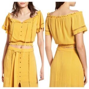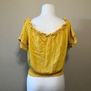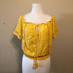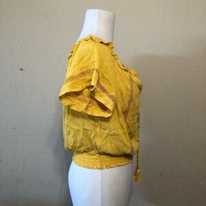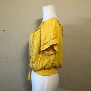 A gauzy tie-neck top styled with airy crochet insets and a ruffled smock waist is pulled off the shoulders for a warm weather-ready look. This style fits true to size. Tag has been removed for comfort and does not affect the wear of top.