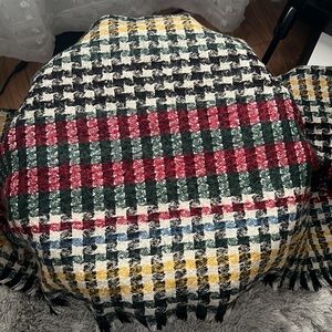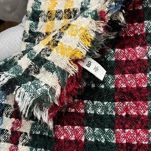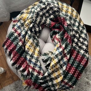 BP. EUC. No damages. Tan, red, black, yellow, green, and blue. Blanket scarf. Winter. Fall. Plaid print, fringe ends. Oversized scarf. Cozy. Accessory. Bundle multiple items for savings! Smoke free home.