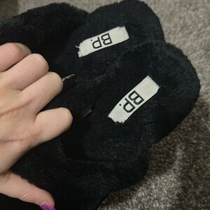 Soft and plush slippers by BP. Ideal for comfort. these have a cross cross strap. small mark in the fur on the one slipper might be able to fix it. size 7