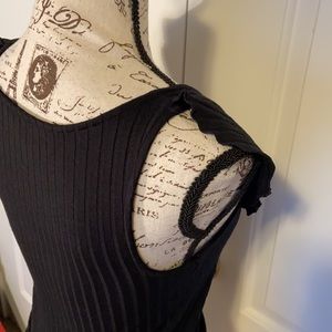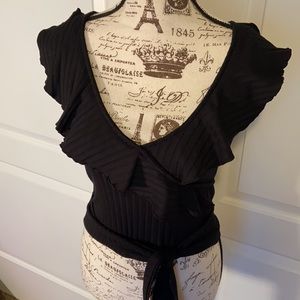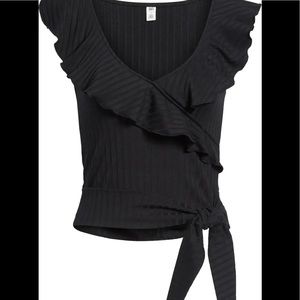 Lettuce-edge ruffles trim the surplice neckline of this wrap-style ribbed top