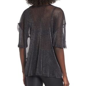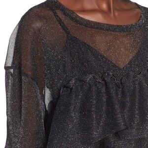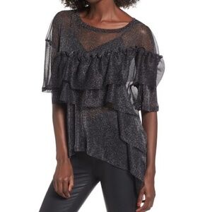 BP - Ruffle Black Metallic Mesh Tee. Tiny silvertone threads add starlike sparkle to this sheer mesh top festooned with playful ruffles. 25" length.Crewneck. Elbow sleeves.Sheer; lining shown not included. 86% nylon, 14% metallic fibers.