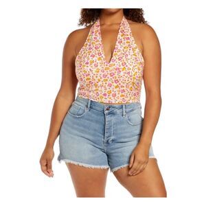 BP Sally Retro Floral Halter Top White Orange Pink V-Neck Smock Back 3X