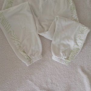 BP. White and Green Self Discovery Sweat Outfit. Size 2X. top has the unfinished crop top look. pants contain side pockets see photo showing where they are located. Measurements : Shoulder to Hem 18 1/2" PTP 25" inseam on pants 25 ".
