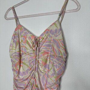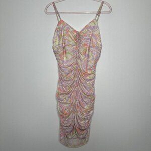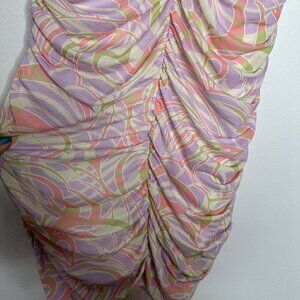 BP Slip Dress Y2K Purple Cream Bodycon L Roxie Abstract Ruched Tie Front Stretch