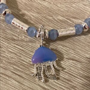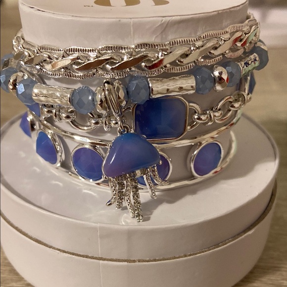 BP Spring 2025 spring stack. Lab created stones on silver plating. 2 pulleys, one stretchy beaded(jellyfish) and one cuff. Just noticed the jellyfish is missing one tentacle☹️.(pictured) Worn handful of times and absolutely love. I just don’t wear bracelets that often.