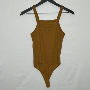 BP. Square Neck Tank Style Ribbed Bodysuit in Camel - NEW - Size XS. New with tags. Square neckline with scalloped edging, thong style, 2 snap closure, ribbed, tank style. Approximate measurements: 12 1/2" bust, 24" length from top of strap to snaps on gusset. Sold at Nordstrom.