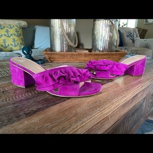 BP Suede Fuchsia Ruffled Block Sandals