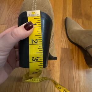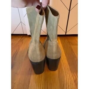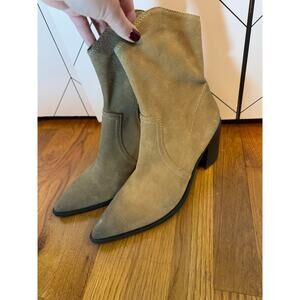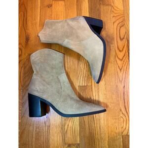 BP Surina Lea Women’s 10M Leather Suede Tan Chunky Block Heal Ankle Bootie Boots. Fully inside zippers. Rustic broke in suede. Pointed toe.