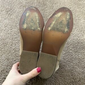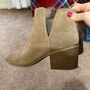 These are a tan color. they have a cut out detail on the ankle. they have a block heel. size 9.5