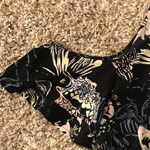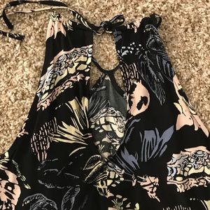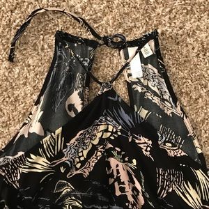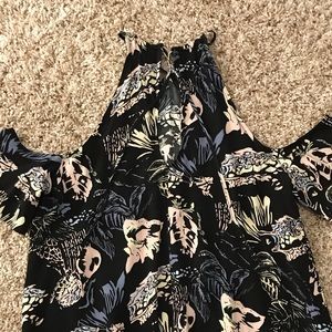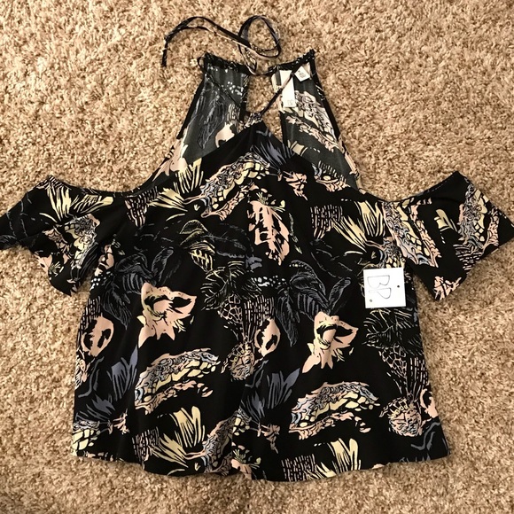BP. Cold shoulder top. NWT Size XS. Pattern is very pretty and the colors really stand out against the black. Ties behind the neck 100% rayon