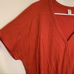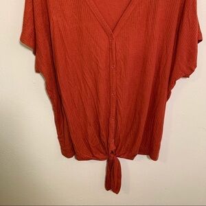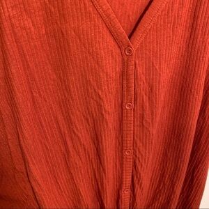 Great condition. BP. V-Neck Button down tie front top. Ribbed. Rust red/ orange color. Style BP397535MI. Size medium. 60% polyester, 40% viscose. Pit to pit laying flat 25” Shoulder to hem 25”. All measurements are approximate and taken lying flat. Smoke free home. No trades, offers welcome.