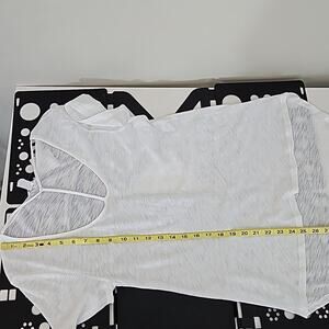 White, short-sleeve tunic top from BP. Features a criss-cross detail on the deep scoop collar and a drop hemline. Made from a lightweight cotton and modal blend fabric. This top is sheer (see thru).