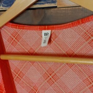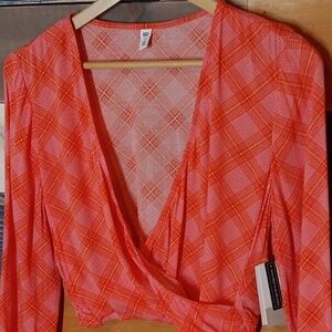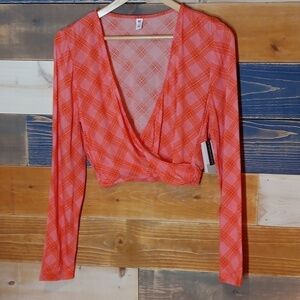 BP faux wrap top in a size S. NWT. Pink, orange, and soft yellow plaid. Cropped length with full-length sleeves.