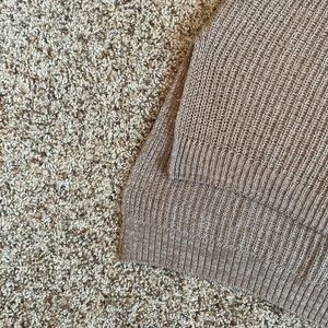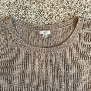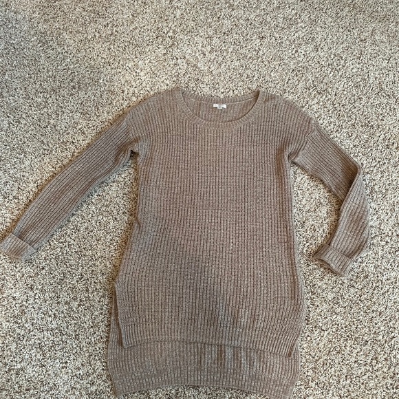 Brown sweater with white knit details. Sit slit and high low cut