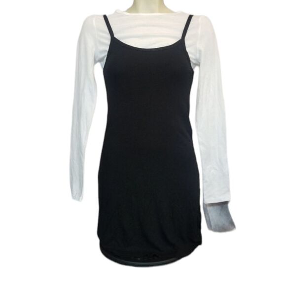 In excellent condition Shell is 96% Rayon 4% Spandex Top is 100% Cotton Spaghetti strap dress with built in white long sleeve shirt.