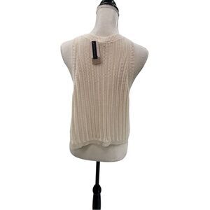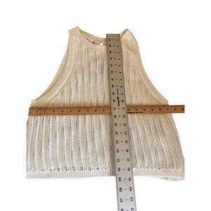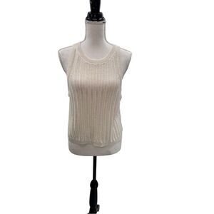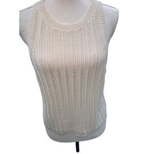 Open-knit cream sleeveless sweater tank by BP in size 2X. Features a ribbed crew neckline, ribbed hem, and vertical textured open-stitch design throughout. Lightweight and slightly see-through. Approx. 19” across underarms and 21.5” from shoulder to hem.