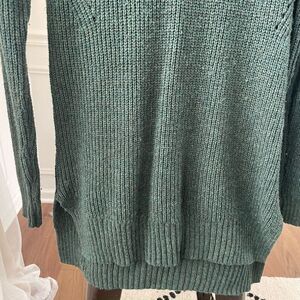 BP dark green women’s ribbed lightweight tunic sweater with notched hip for easy movement. Cotton blend. Pine evergreen green. Laying flat measures 30 inches shoulder to ham and 19 inches armpit to armpit. Sweater is oversized and I wore it as a medium. No noted flaws.