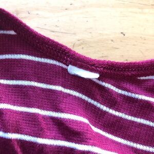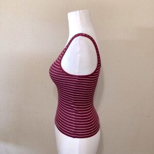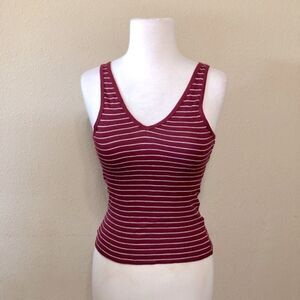 Slim stripes circle this soft and stretchy knit tank with an alluringly rounded V neckline. Please note tag has been removed for comfort; see measurements. Stock photo is in black-and-white to show the detail. The color of shirt is a maroon.