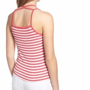 In good gently used condition. Basic pink and white stretchy r tank top with cute strappy caged detail in the back. Size medium