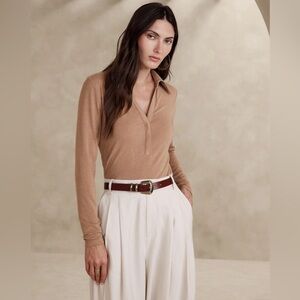 “Plateau Beige” Aleah Luxe Johnny Collar. Made from a luxuriously soft wool-blend jersey, in a light weight that's suitable for several seasons. Traditional collar offset by a v-neck. Great dressed up or down. Also available in “Transition Cream White.” worn once, too large, significant weight loss.