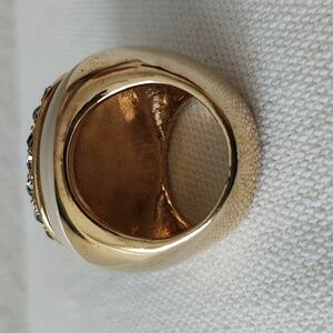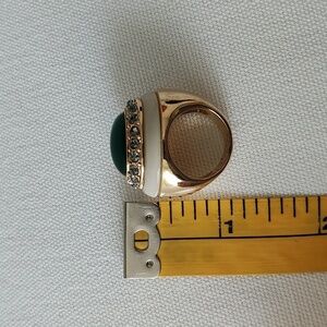 Middle stone is emerald in color, with ivory color around the faux clear stones, band is gold tone.