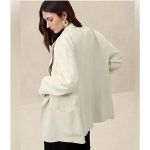 This oversized blazer from Banana Republic showcases sophisticated European craftsmanship. Constructed from luxurious satin crepe fabric sourced from Italy's Manifattura Emmetex, this double-breasted piece features a classic peak lapel and a fully lined interior for optimal comfort. Styled with functional touches like three exterior pockets and two interior pockets, as well as a center back vent, it is a versatile addition to any wardrobe, seamlessly blending style with practicality.