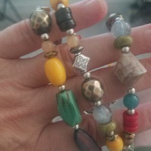 Nice accent piece for any wardrobe, for any occasion. Three (3) rows, multi-colored with multiple types of beads, faux stones, etc......... the clasp is a faux clasp, as the bracelet is stretch, so it will fit any wrist, any size, small or big.........have worn with jeans, work and evenings out....