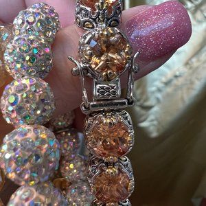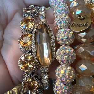 5 beautiful mixed metal color bracelets, 2 are stretch, 2 are adjustable, 1 with topaz colored stones has a double-safety catch. Wear them together or separately, with jeans, or with cocktail attire. Pairs wear with black, white clothing.