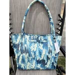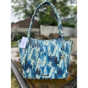 The Brahmin Bailee Deep Water Melbourne Genuine Leather handbag is a large rectangular shoulder bag with a zip closure and blue leather handles. It features gold-plated hardware, inner pockets, and a stamped/embossed finish. The exterior is made of leather with a tie-dye pattern, and the lining is beige fabric. This designer handbag is part of the Brahmin Duxbury collection and is perfect for adding a touch of luxury to any outfit.