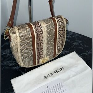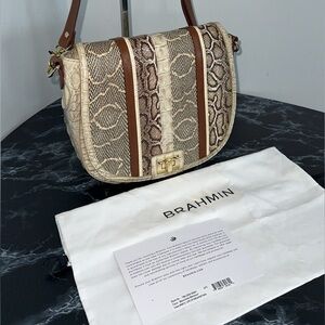 The bag has a beige leather lining. The exterior of the bag has a stunning sonny oleta pattern and the strap is cream colored. This designer crossbody bag is part of the Brahmin Sonny product line and is a must-have for any fashion-forward woman.