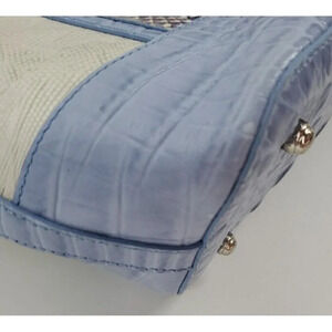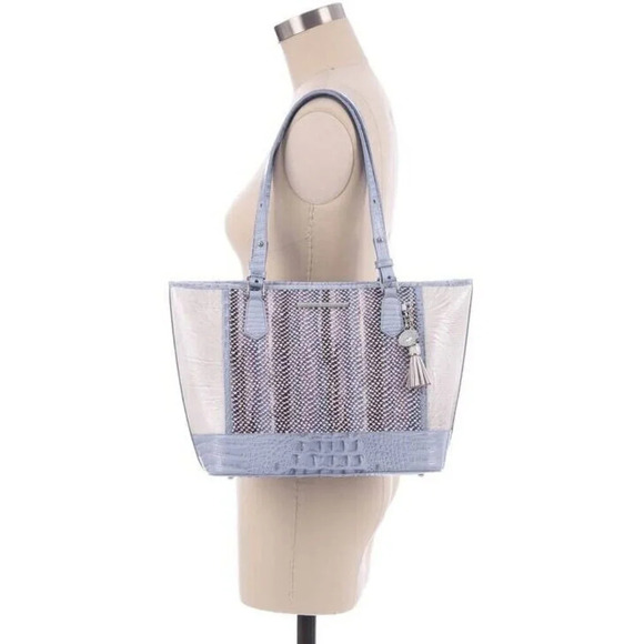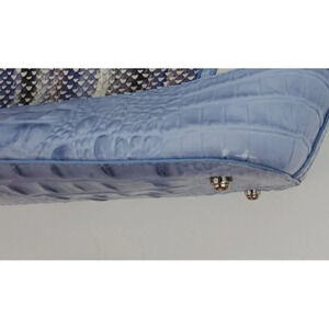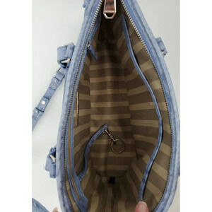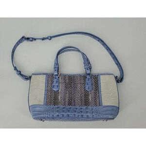 Up for Consideration is this Beautiful BRAHMIN Mini Asher Purse Periwinkle Monroe Leather Crossbody. The Mini Asher Satchel is a Perfect Everyday Satchel for On the Go. It is Large enough to Carry your Essentials and Small enough to Carry with Ease. This Small Zip Top Satchel can be Worn Two Ways: Carried with Double Adjustable Handles or as a Crossbody with a Removable, Adjustable Strap. Features: Small Zip Top Adjustable Double Handles, Removable Adjustable Crossbody Strap, Bottom Feet, Back Slide In Pocket, 5" Handle Drop, 23.5" Strap Drop. Measures: 13.5" W x 7.5" H x 4" D. Only Noticable area is some coating wear on ends / corners which I have provided pics. REFER TO ALL PICS. Pictures are of actual item and also part of Description.