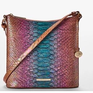 Featured in Multi Stellaris, a dramatic ombre blending deep blue, purple, pink, and orange hues on an all-over embossed snake texture with a sparkly metallic finish. Genuine leather.