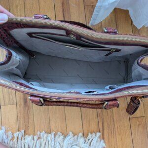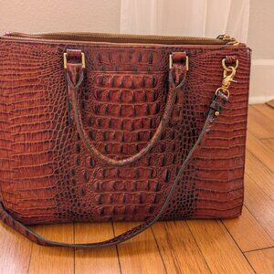 BRAHMIN Pecan Melbourne Tote / Carryall Purse. Genuine croc leather. 14.5" w x 10.5"h x 5"d. Spacious silhouette that fits all your essentials, even most laptops. Two rolled handles plus an adjustable shoulder strap that extends to 3 feet in length. Footed bottom. Large center space in carryall with two interior zip pockets, double kangaroo and pen pocket, and inner key clip. Center magnetic easy open bridge magnet closure. Two additional full sized zippered pockets on either side of the large center carryall space. Exterior slide in cell phone pocket. Brahmin charm on exterior of bag still has the plastic protector in place. Use about 2 times. Includes original duster bag. Purchased in 2015 or 2016. Exceptional, like-new condition.
