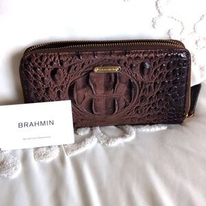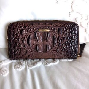 Suri is an everyday wallet with elegance. The zip around style keeps your essentials safe, and credit card slots and zipped pockets keep you organized. Featured in Brown Melbourne, croc-embossed, Brahmin exceptional quality