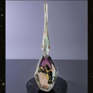 This exquisite vintage 1993 Brakken Studio Art Dichroic Foil glass perfume bottle features a captivating 40s style long glass stem applicator.
