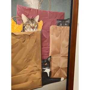 Framed measures 33" x 24". Beautiful painting print on canvas of cats being silly and curious, climbing into paper bags. Cheerful, colorful art in vivid colors and high definition. Signed and numbered by the artist. Limited Edition 131 of only 150