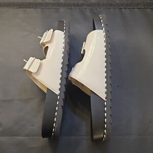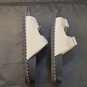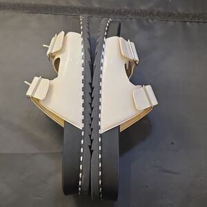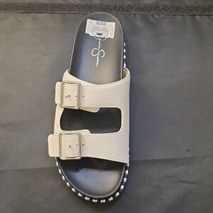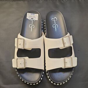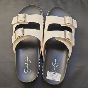 BRAND NEEW JESSICA SIMPSON WOMEN'S DOUBLE BUCKLE SANDALS SIZE 8M/39 COLOR WHITE with BLACK BOTTOM Step into comfort with these stylish double buckle sandals. Perfect for any casual outing.all man-made materials lining man-made material cut out design open toe THIS ITEMS IS BRAND NEW WITH TAG NO BOX CHECK THE PICTURES(FYI THE FIRST PICTURES IS JUST A MODEL TO SHOW WHAT THE SANDAL LOOK ON CHECK THE PICTURES)