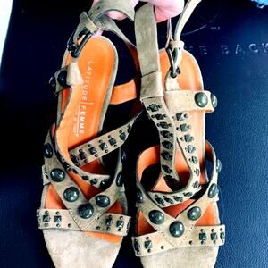 NEW Latitude Femme strappy suede sandals from Italy. Olive or army green suede leather with matching studs on straps. High slim heels. size 38. All season sandals . Can be dressed up or down - great with jeans, camo pants, mini dresses, maxidresses,