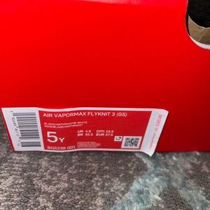 Brand new 5Y (or women’s size 7) Air Vapormax FLYKNIT 3 (GS), Black/Anthracite-White, these are authentic NIKES ( not fakes), comes with box (no lid), pictures of part of the description.
