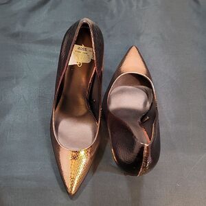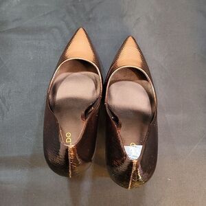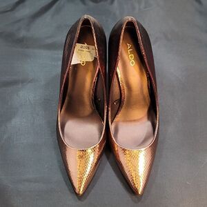 BRAND NEW ALDO LEOPARD POINTY TOE HIGH HEEL STILETTO PUMP SIZE 10M COLOR OMBRE METALLIC this Pretty snakeskin Embossed in points and stiletto heels, pumps from Aldo are a gorgeous addition to both dressed up and casual styles alike Get ready to fall head over heels with these stunning shoes Made of synthetics materials Regular heel: stand tall and look great in these heels Pointed toe Slip on Leather or manmade uppers; manmade lining; rubber sole Classic Stiletto Pump A shapely half d'Orsay pump offers instantly chic style with a pointy toe and soaring stiletto heel. 3 1/2" heel Leather upper/synthetic and textile lining/synthetic sole Imported Lining Material Synthetic And Textile Heel Height3 1/2"Imported True StyleStiletto PumpSole Material Synthetic Toe Pointy
