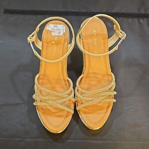 BRAND NEW ANDIAMO MULTI-STRAP RHINESTONE EMBELLISHMENTS ROUND-TOE OPEN- WEDGE SANDAL SIZE 71/2 COLOR GOLD MADE ALL MAN-MADE MATERIAL LINING UPPER MAN-MADE MATERIAL HEEL HEIGHT MEASUREMENTS APPROXIMATELY 3".15INCHED THIS ITEMS IS BRAND NEW WITH TAG NO BOX CHECK THE