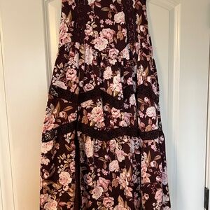 Boho floral maxi skirt with a romantic fall vibe! Features a high waist and front slit for a flattering fit. Rich burgundy base with pink floral print and lace trim. Perfect with cowgirl boots or sandals for a feminine western look.