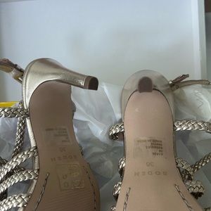BRAND NEW! BEAUTIFUL! Boden Woven Multistrap Heeled Sandal Leather. GLD: upper 100% metallic leather. Insock and lining 100% leather