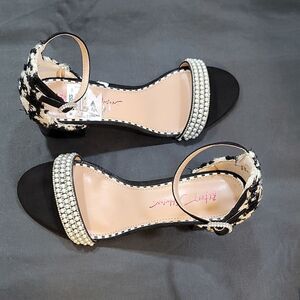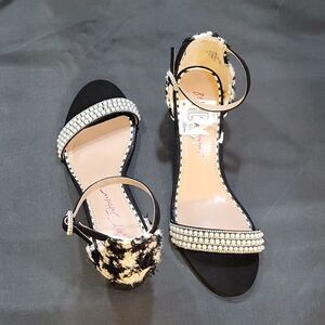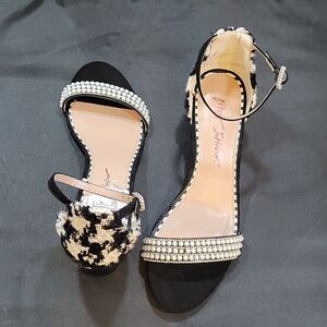 BRAND NEW BETSY JOHNSON LOW BLOCK-HEEL SANDAL SIZE 6.5 COLOR BLACK &WHITE ADJUSTABLE BUCKLE STRAP closure open toe double pearl studded strap and back strap closure made with fabrics upper sole material balance manmade 3"INCHESStep into style with the STONE bridal heel. Featuring a minimal design and thin straps, these heels will elevate your formal day look. Say yes to comfort and elegance!Satin textile upper material with stones Synthetic lining/sockvSynthetic Betsey Blue sole 2.5 inch heel height THIS ITEMS IS BRAND NEW WITH TAG NO BOX CHECK THE PICTURES